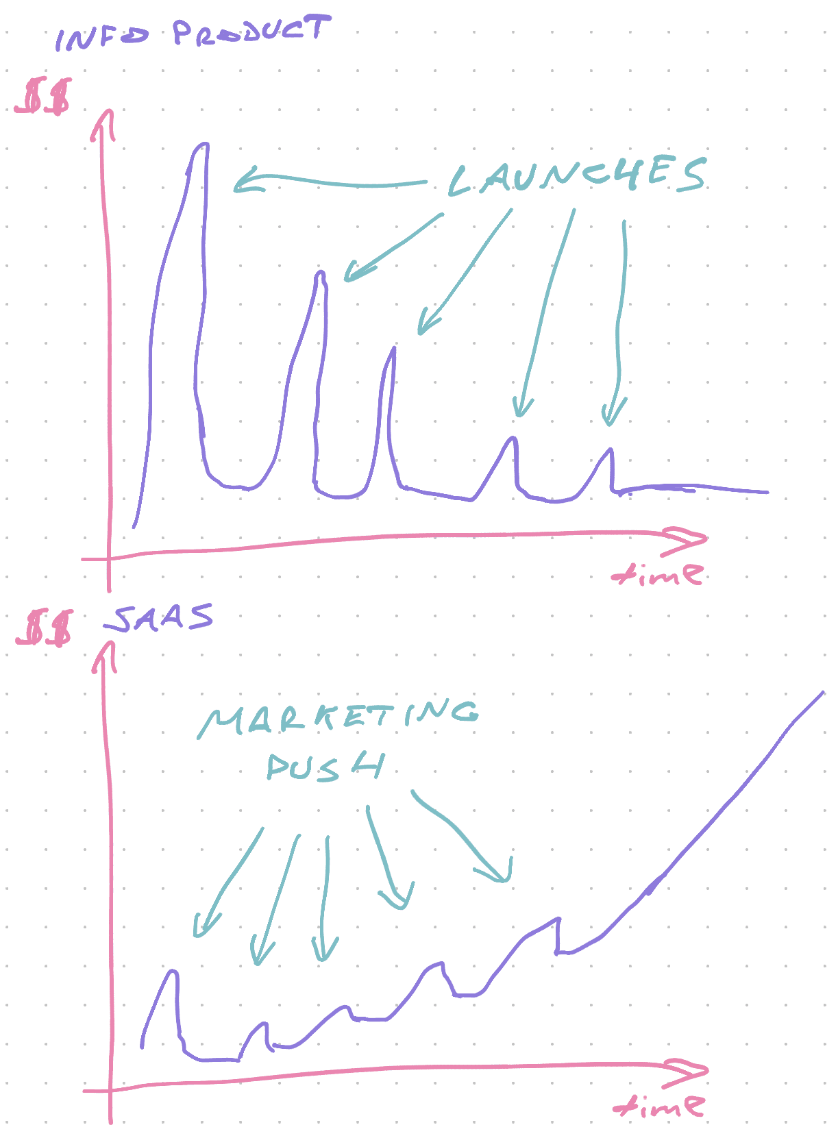 But unlike a SaaS business, info products have a reverse growth curve. Splash at first then taper off. SaaS is slow at first then ramps up.