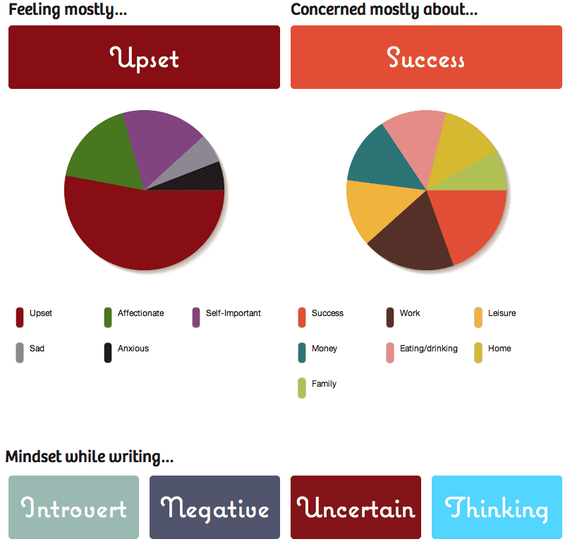 Oh and 750words also does one pretty cool thing. It analyzes everything you've written and provides a very plastic view of things that are troubling you. It's a bit rudimentary so it doesn't always get it perfectly (it thought I was concerned about death when I wrote about how awesome Shutter Island was) ... hell, this part of hte website is so awesome I'm thinking about making some sort of plugin and always displaying the charts in the footer of this blog.
