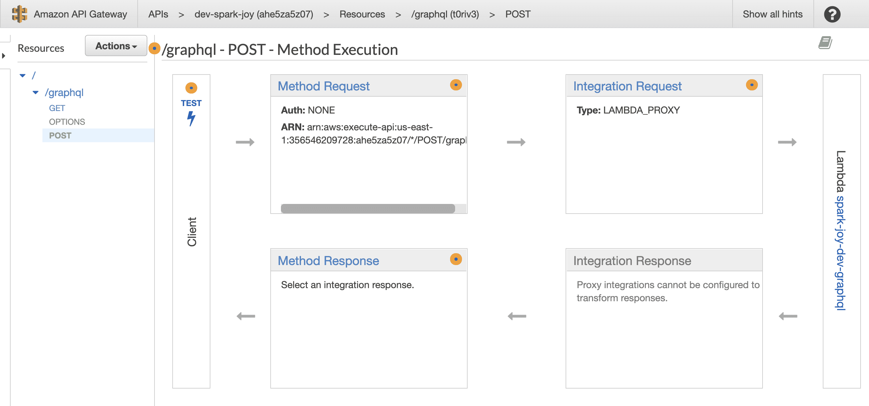 Looked into the AWS dashboard. Spelunked through the UI and found a configuration for our APIGateway. Everything looked right. GET requests connected to our lambda. So are POST requests.