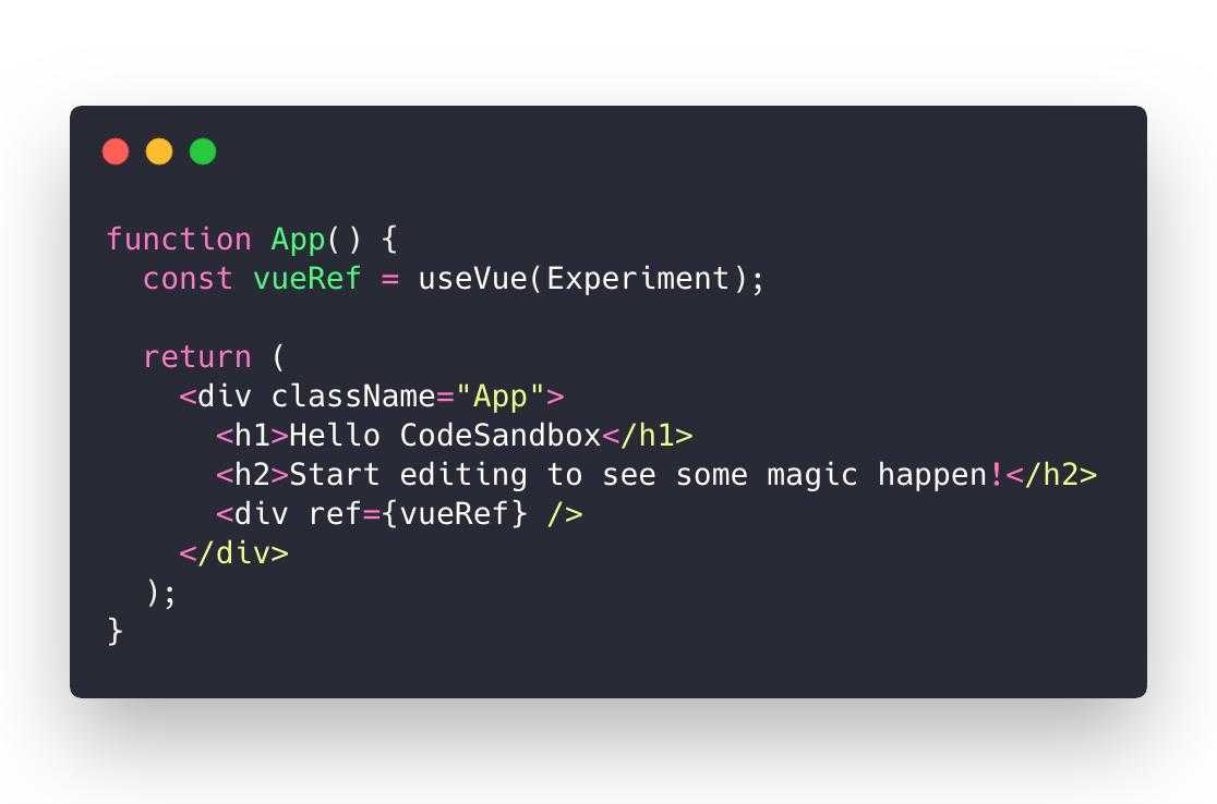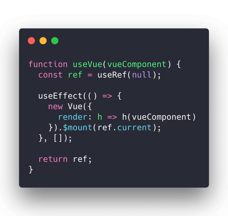 The goal was to build a useVue React hook that would let us render Vue components inside React. Why would anyone do this? Good question.