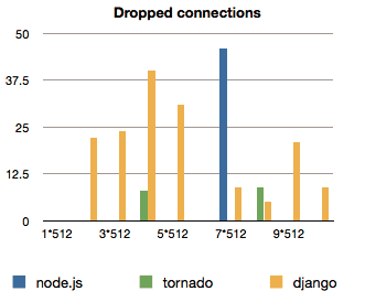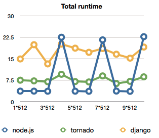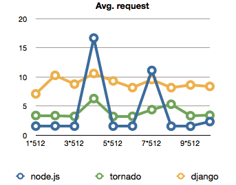 Either way, I ended up testing node.js and django, then just because the whole test is a bit unfair to django, I added Tornado, which is supposed to work a bit more the same way as node is.
