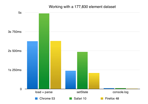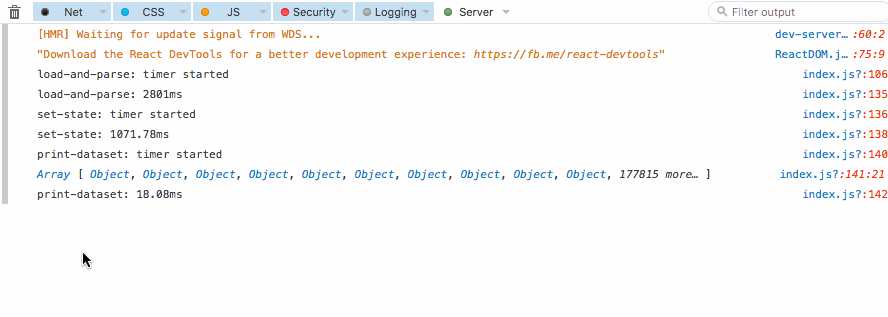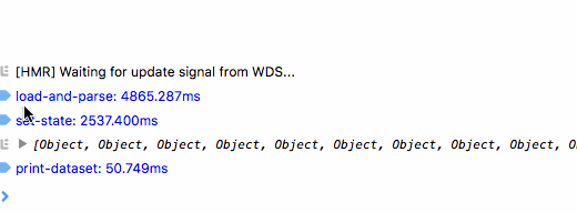 Not to mention the initial page setup. Loading and parsing the dataset (CSV) from cache takes about 3 seconds, running the initial setState takes about a second. That’s up to 5 seconds between every full page reload and seeing output.