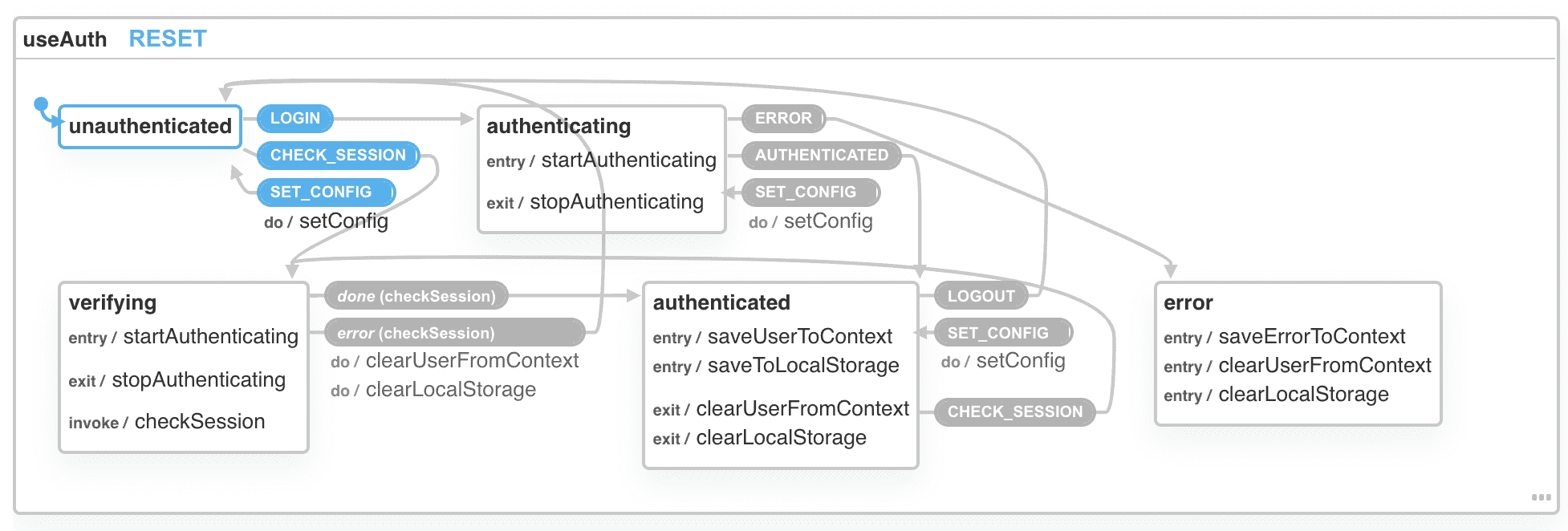 To make that happen, it uses a side-effect to call a checkSession function on the auth provider. That method is meant to phone home, check your cookies, whatever it needs to decide "Is the current user still the current user?"