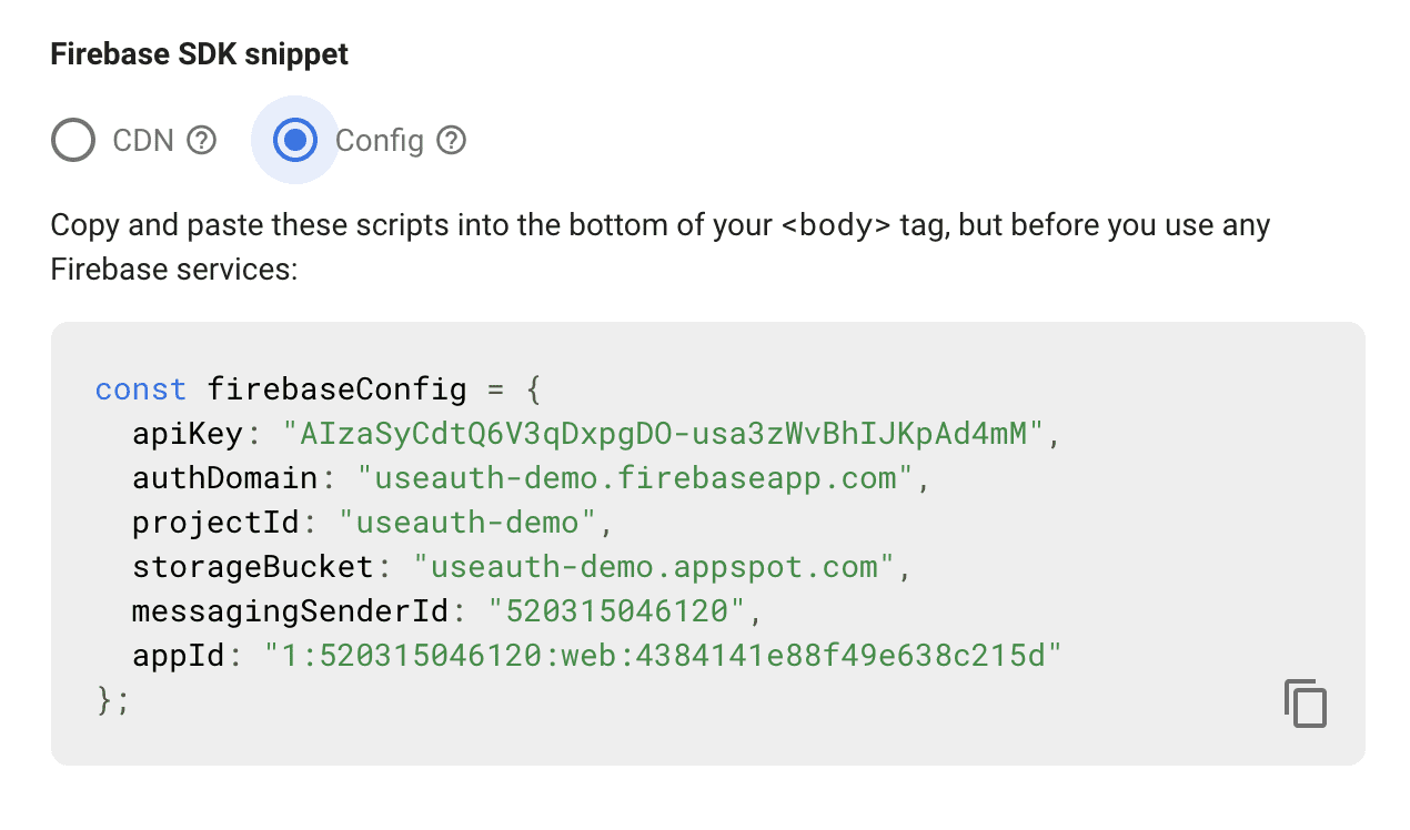 // as a user<AuthConfigauthProvider={FirebaseUI}navigate={navigate}params={{// Firebase standard practice to copypasta this blob?firebaseConfig: {apiKey: "AIzaSyCdtQ6V3qDxpgDO-usa3zWvBhIJKpAd4mM",authDomain: "useauth-demo.firebaseapp.com",projectId: "useauth-demo",storageBucket: "useauth-demo.appspot.com",messagingSenderId: "520315046120",appId: "1:520315046120:web:4384141e88f49e638c215d",},}}/>