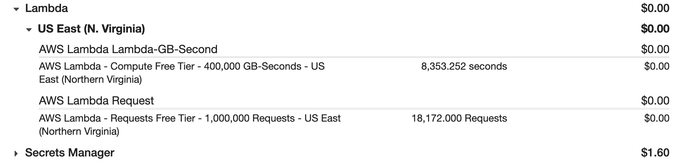 My $12 bill runs all of the above, the biggest cost is serving images from S3 โย $5 for hosting, $3 for bandwidth. The smarts running on AWS Lambda are way below the free tier.