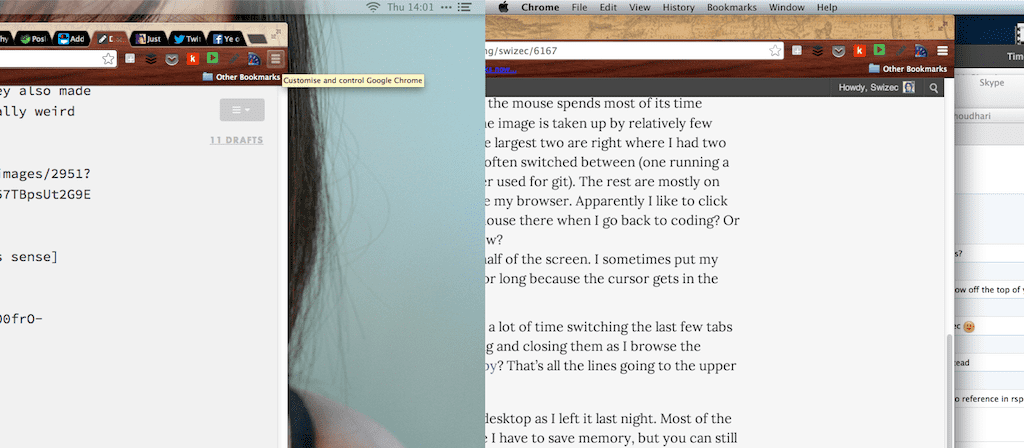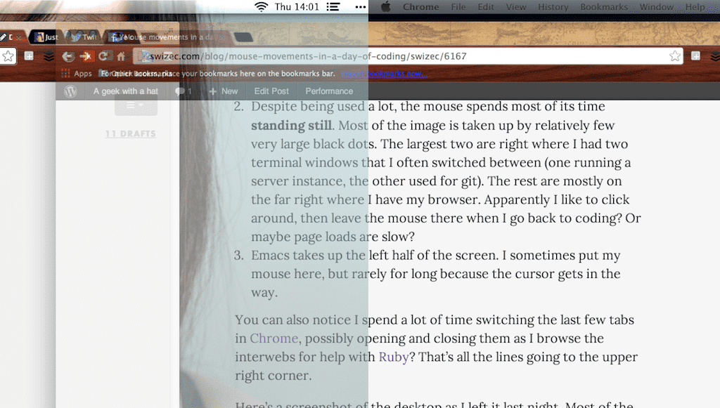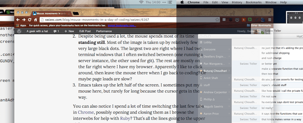 But usually there's two to three terminals, two browsers, two or more emacses and at least one chat program to keep in touch with the team. Before retiring my linux box I actually used the Mac as a dedicated third screen just-for-chats.