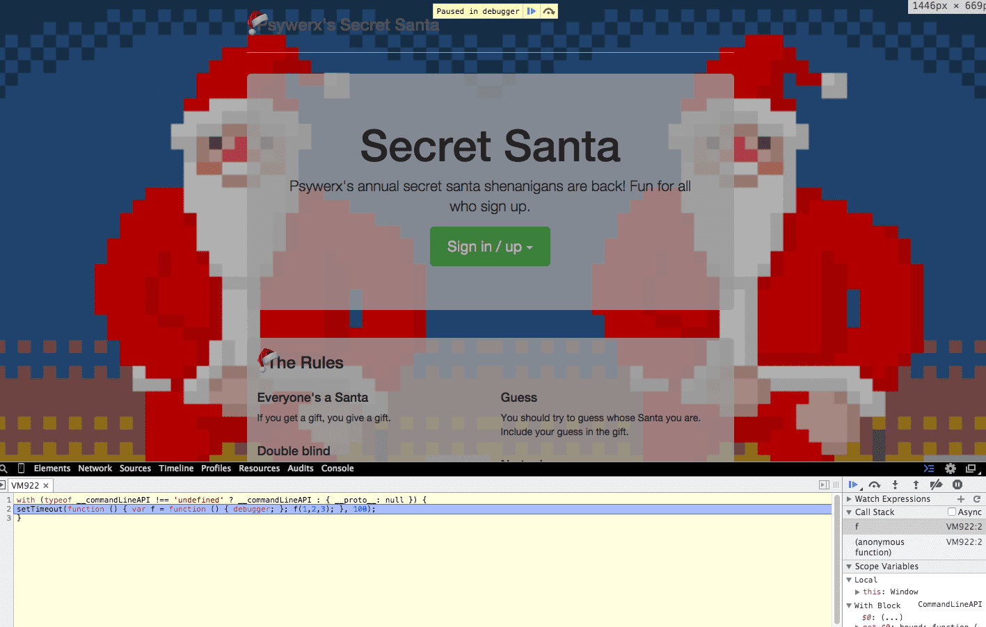 You can't see it in the screenshot, but even GIFs are stopped. A moment ago that Santa was dancing, now everything is in "Holy shit, he's debugging!" mode.