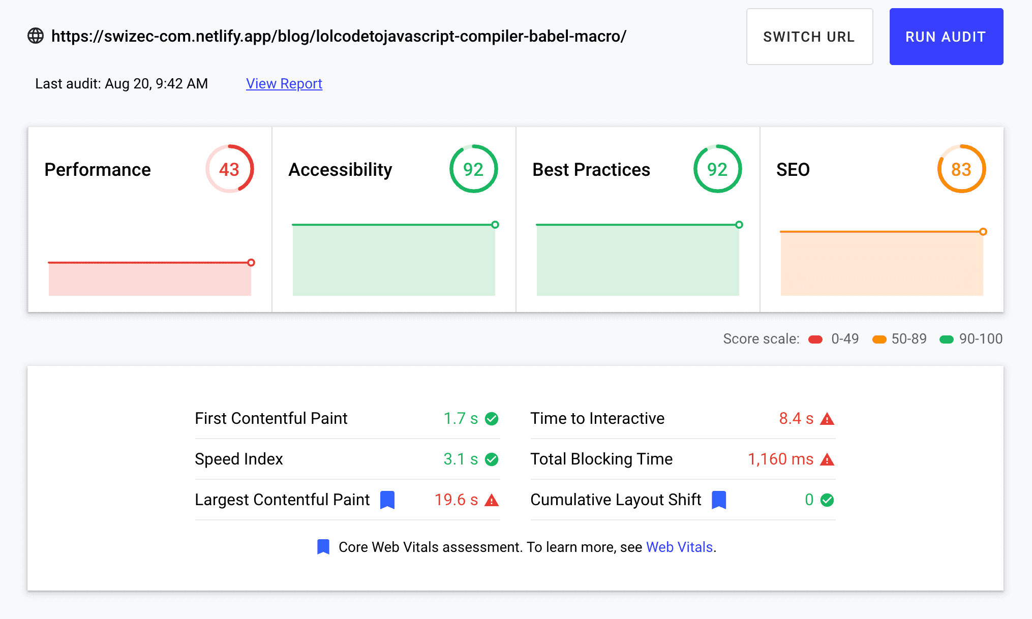 Large articles with embeds and many images are even worse. I managed a cool 9 performance score with the old site ✌️
