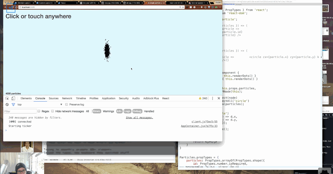 So I took my old particle generator experiment and started playing around. It doesn’t use a lot of d3, but it does rely heavily on React and Redux.