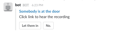 Aaaaaalmost hacked together a Slack bot that can answer the door. There’s one last step to figure out and then we are ready to rock. ??