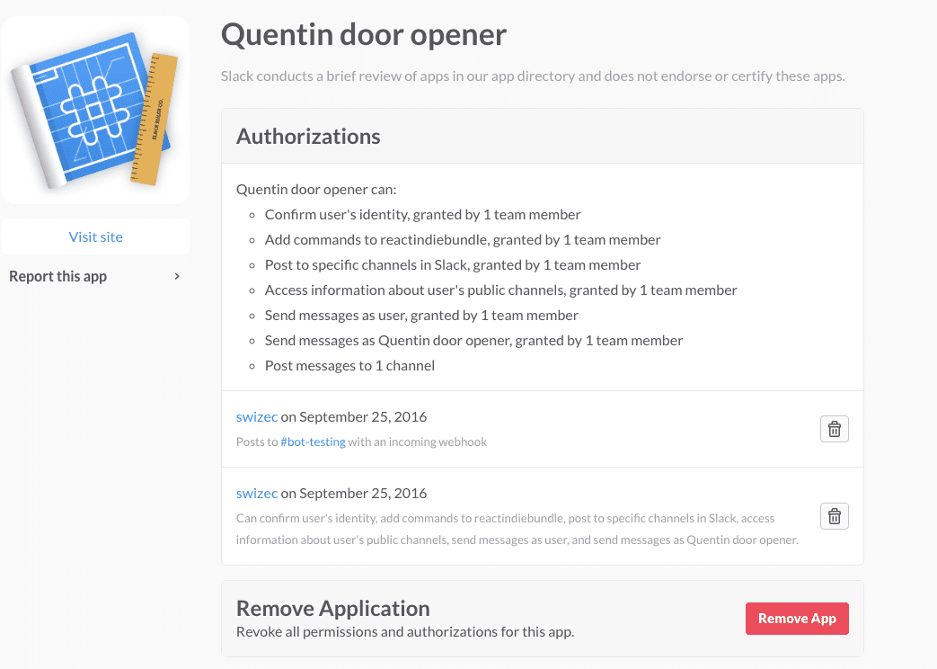 If you go to Slack’s app management panel, you should see something like this: