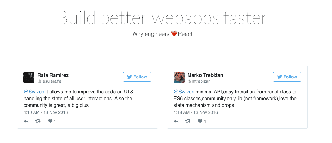 This year's page is built around the "Why we ❤️ React" theme. Last year, it was all about "Take the leap, learn React, it's cool, we promise" and about making more money and building shit faster. That worked great in 2015, but I think that in 2016, everyone already knows a lot of this.