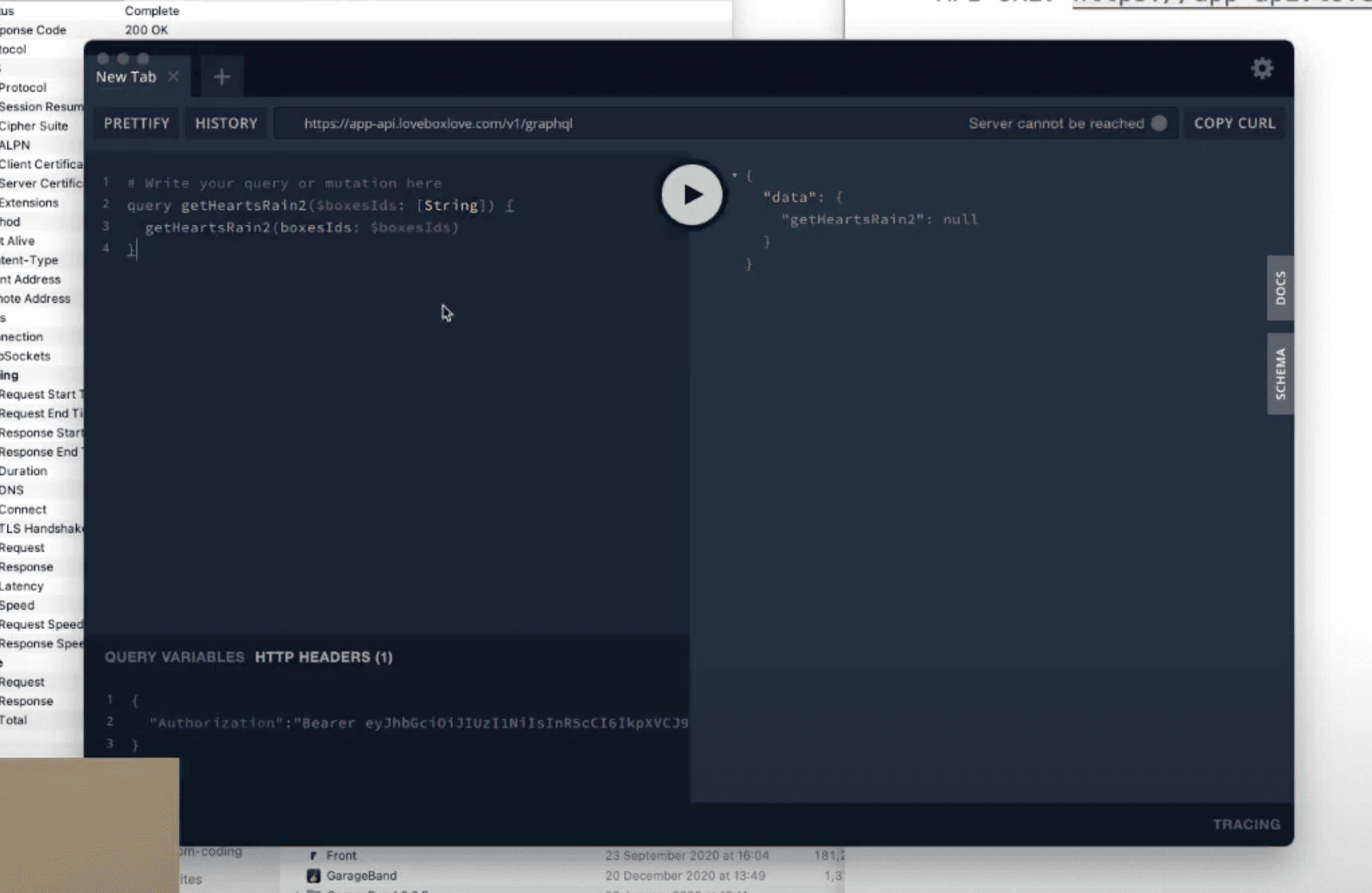 Before you start coding, you gotta verify you can hack the API. We used a desktop GraphQL Client.