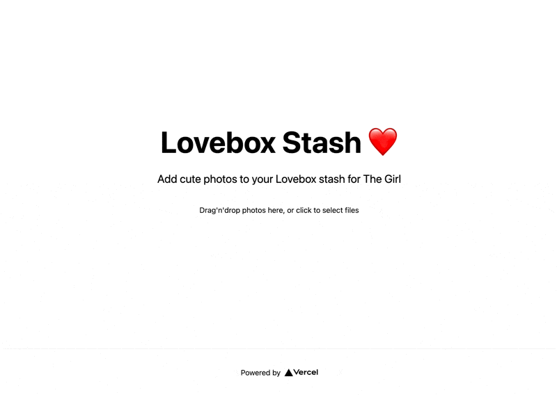 // pages/index.jsexport default function Home() {return (<div className={styles.container}><main className={styles.main}><h1 className={styles.title}>Lovebox Stash β€οΈ</h1><p className={styles.description}>Add cute photos to your Lovebox stash for The Girl</p><LoveboxDropzone /></main>