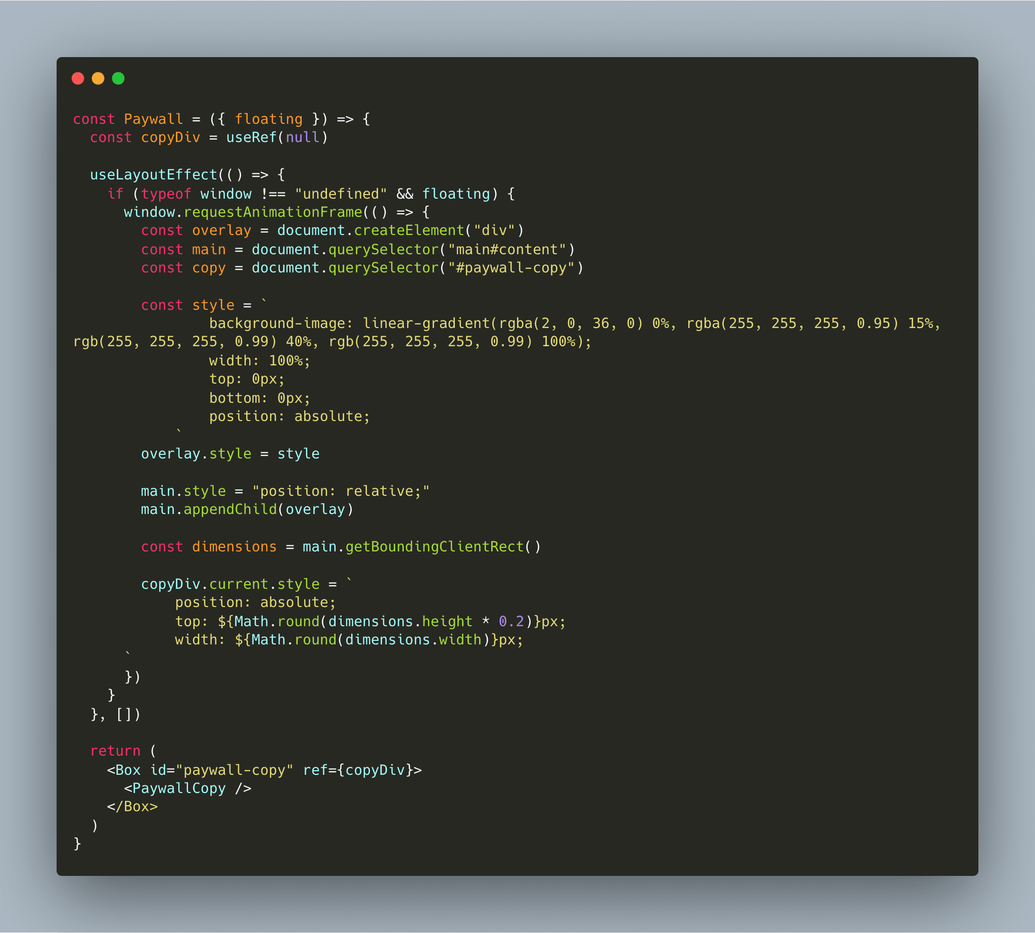 It really is quite a nasty piece of work. We've got a React component that renders the paywall itself.