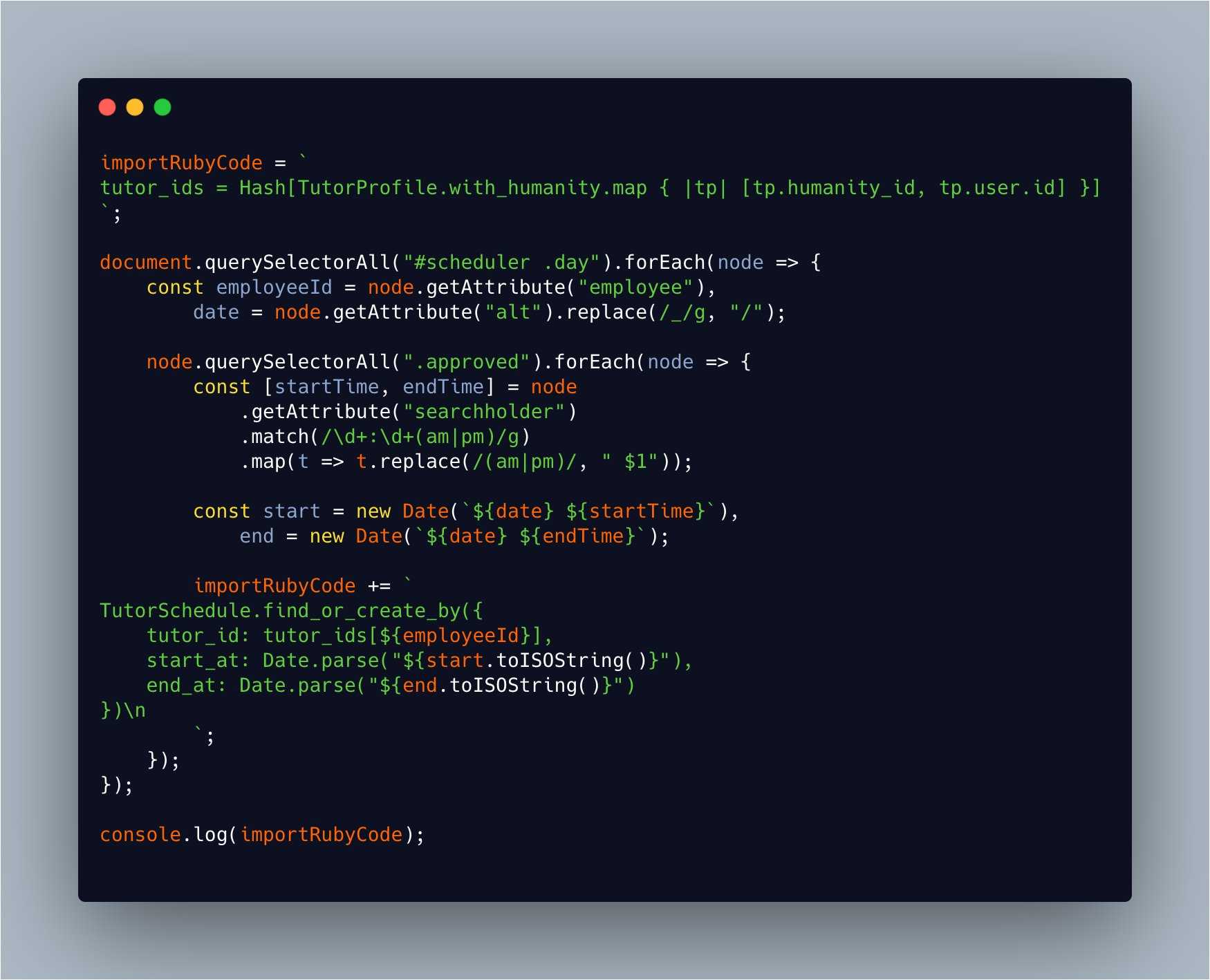 Ran that in Chrome DevTools logged in as admin on the 3rd party app, got the data dump, loaded it into Rails console on our server, and some 80 people got paid on time that day.