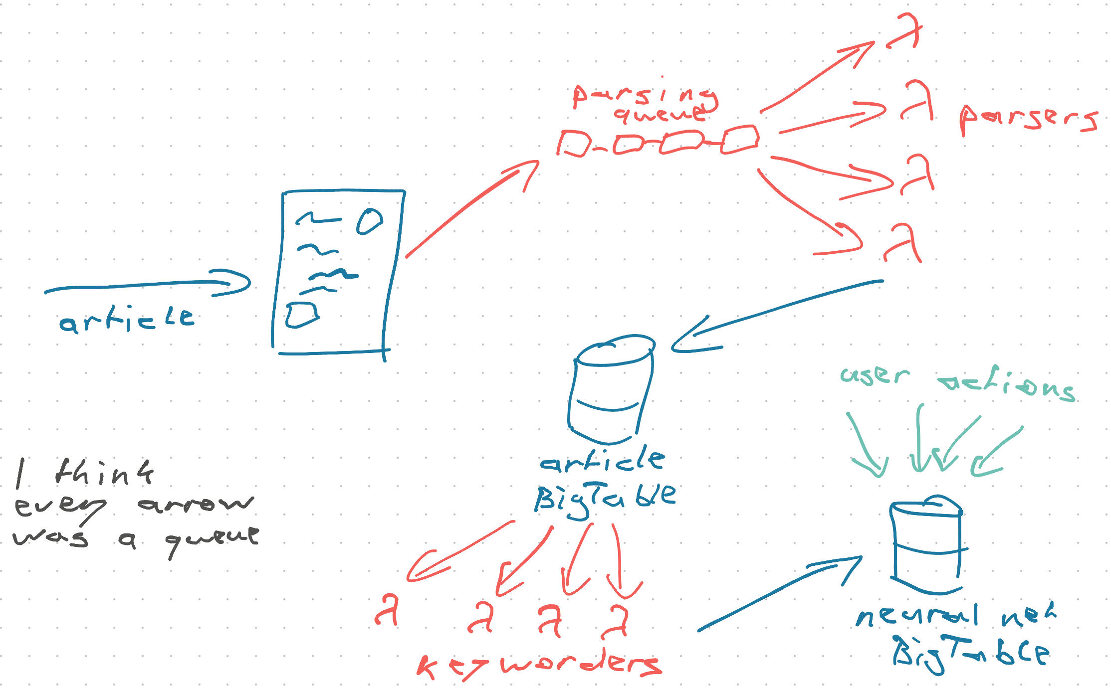 Articles came in through a queue that checked your RSS. Each went into a parsing queue that called a traditional server running NodeJS to extract article text.