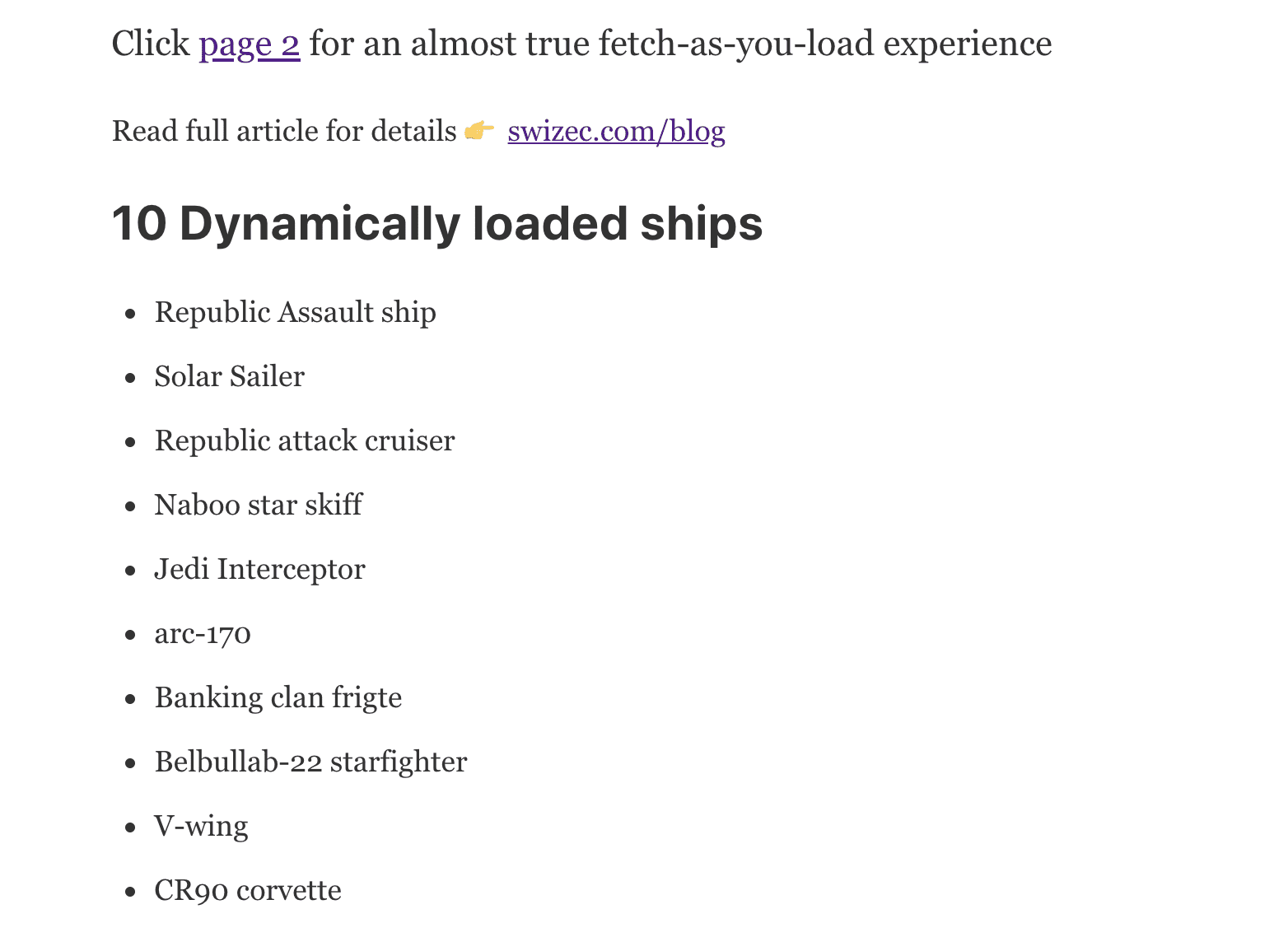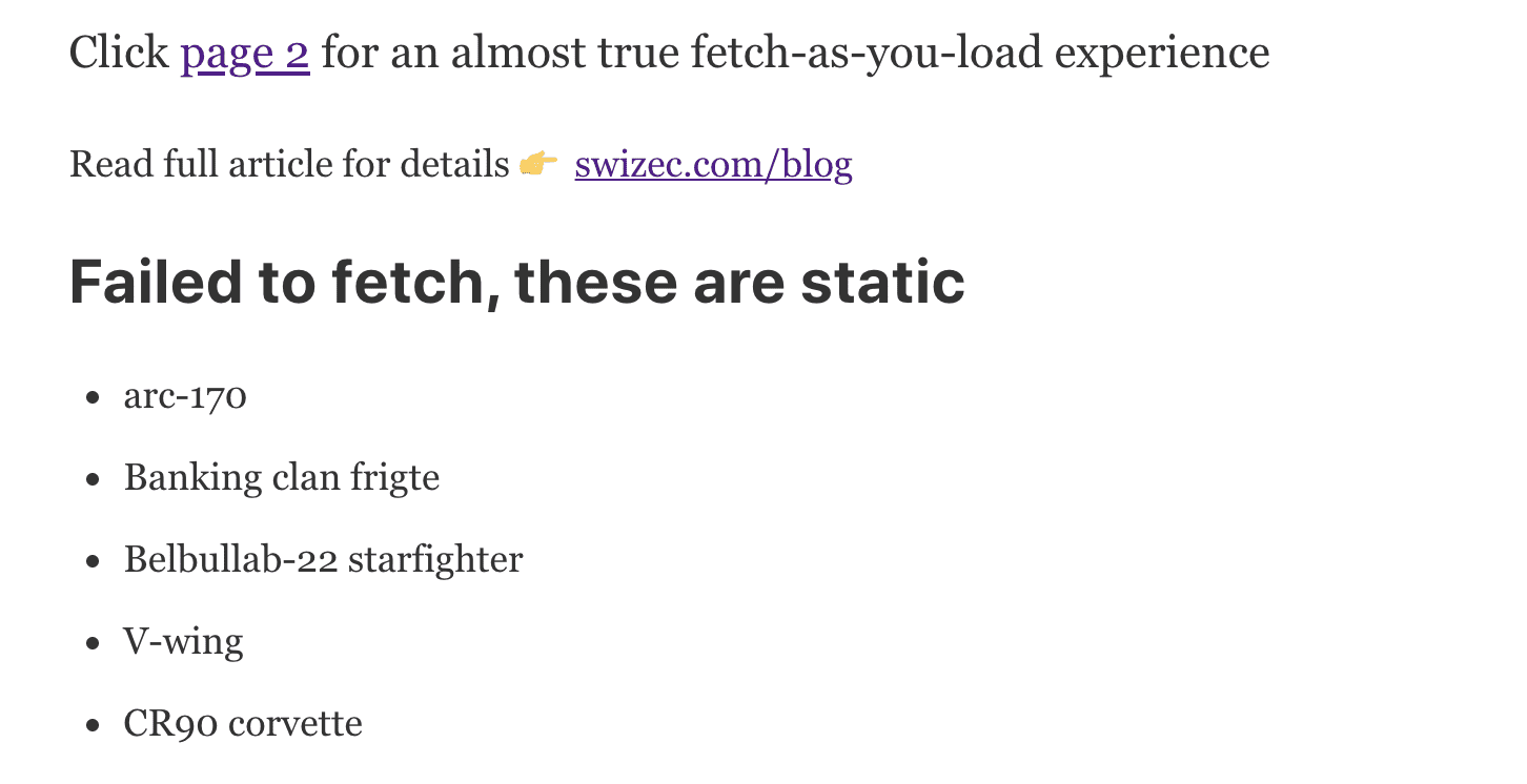 Suspense sees that we're running a GraphQL query (the suspender.read()) so it renders the fallback render prop. But that prop uses our static data to render a list of 5 starships. It's not all of them, but it's better than nothing.