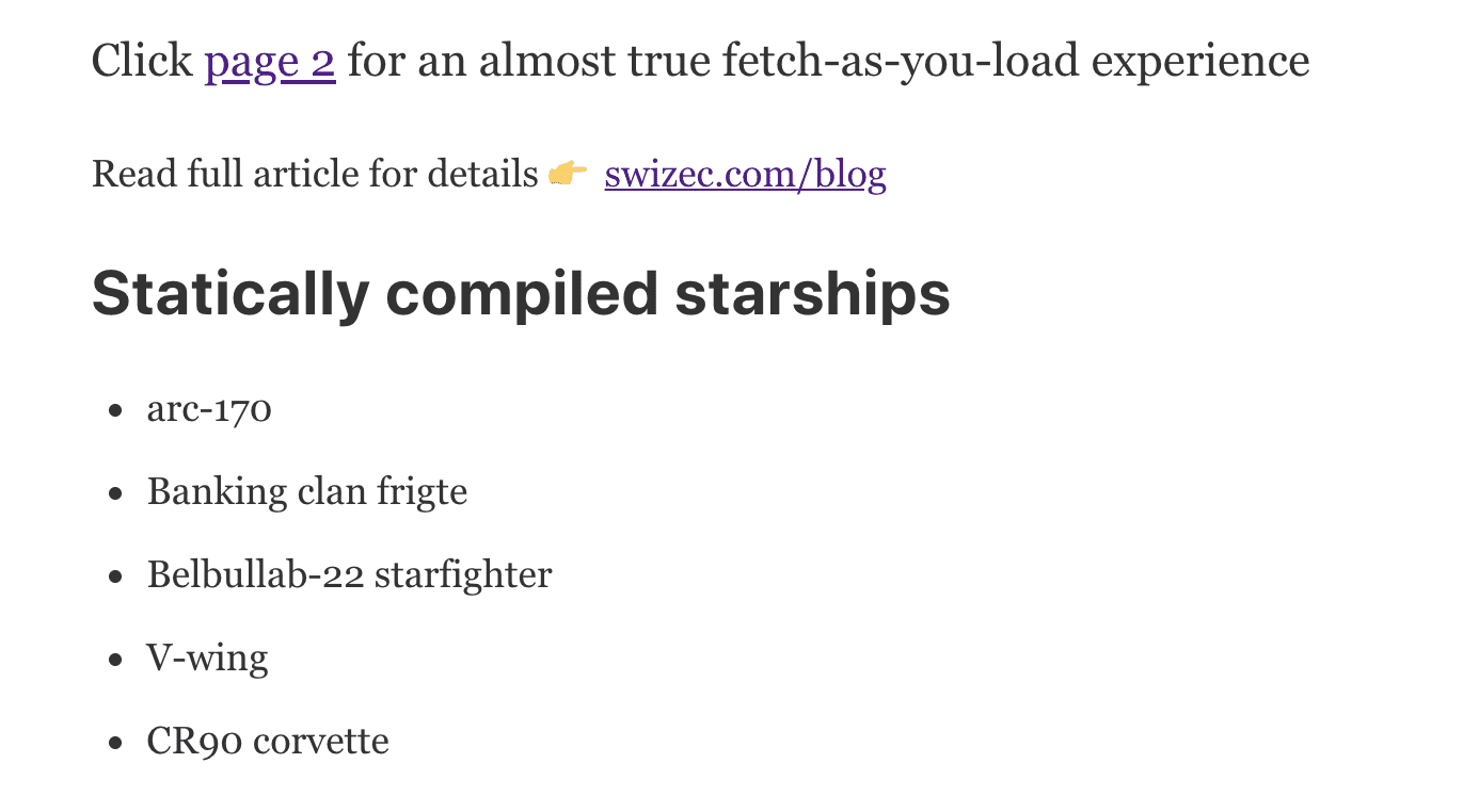 The <Starships> component suspends with a data load and renders <StarshipsList> when data shows up. The static page is going to render this same component with its data.