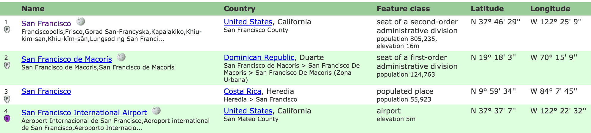 I had to inspect source on the geonames website to find that lookup. This code is fragile, and it will break if geonames changes anything. But the search results page looks like it hasn’t been redesigned in about 10 years, so I think we’re good.