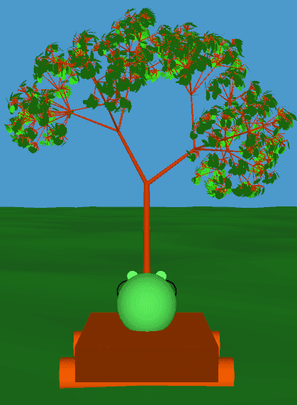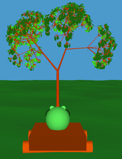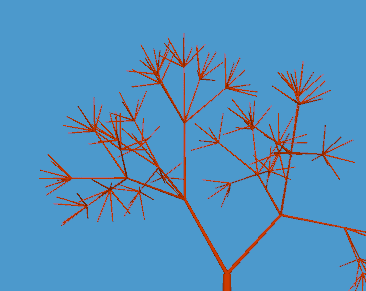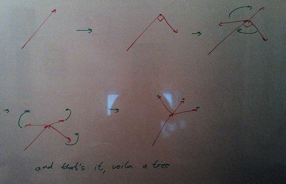 This gives you an evenly sliced plane perched on top of the current branch. Then all you have to do is slant each new branch upwards by a certain angle and you're done. Since upwards can mean anything, you take it to mean the direction the original branch was pointing in.