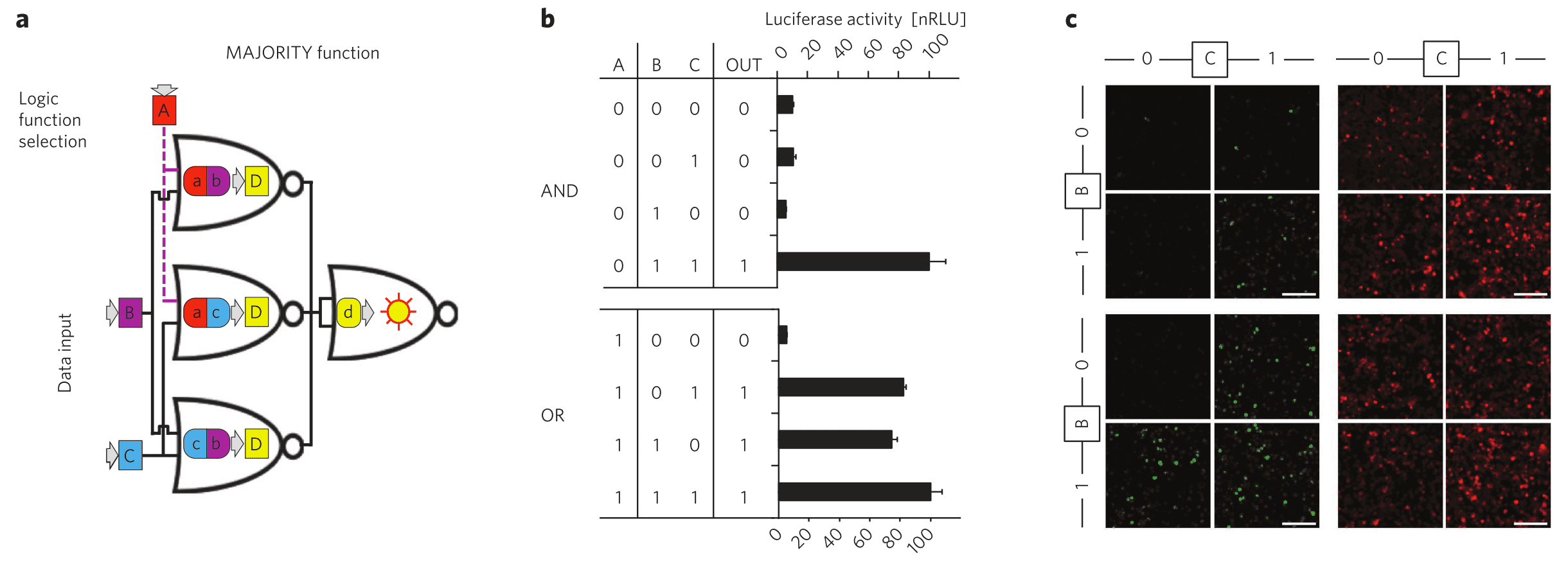 To demonstrate this ability, the authors implemented a simple circuit that takes three inputs and decides whether an AND or an OR function will be performed on two of the inputs, based on the third. A truthy value means OR and a falsy value means AND - essentially the majority function.