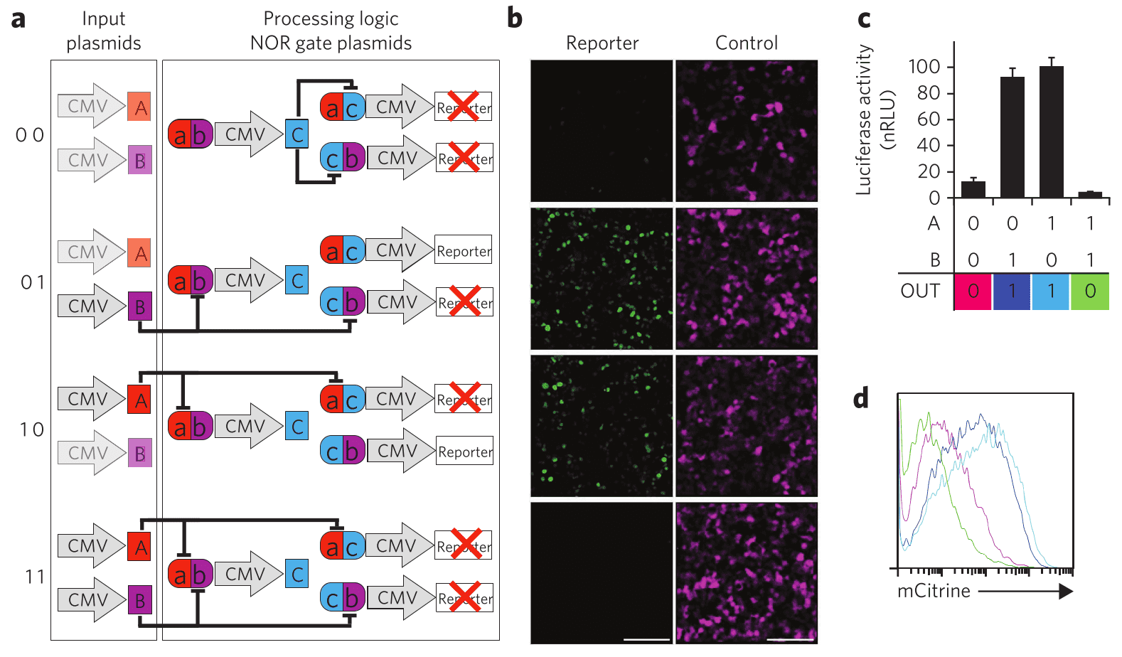 To demonstrate the generality of this design they implemented several different NOR gates that used different TALE repressors in various combinations. They took the experiments even further by implementing parallel NOR gates acting on different expressors within the same cell.