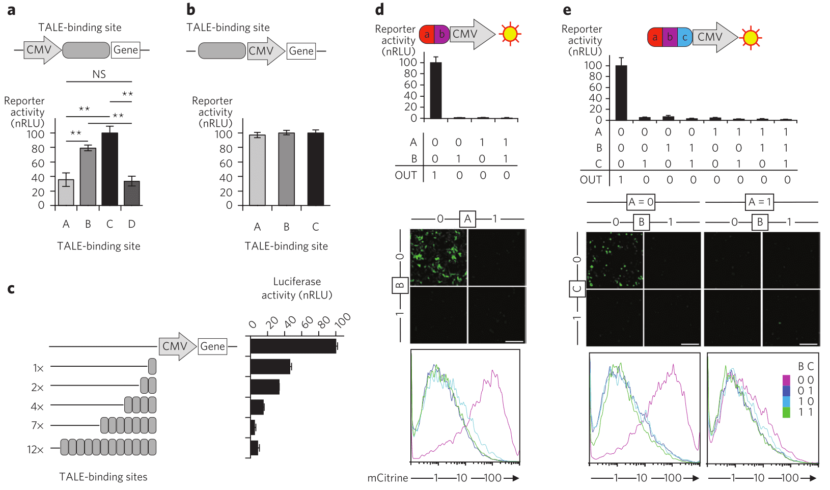 They solved this by positioning TALE binding sites upstream of something called a constitutive mammalian promoter (CMV), which leads to equal promoter activation regardless of binding sequence variability.