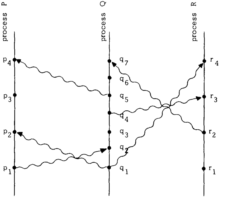 In the image, each line represents a process, a dot is an event and a squiggly line is a message being sent between two processes. Sending a message and receiving a message are both events as well.