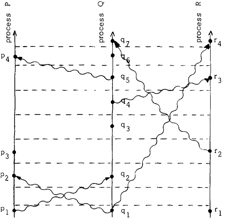 Lamport then goes on to describe how to use clocks to design a system that can organise itself without relying on external data to order events. But this part isn't so interesting, and you can figure out your own example well enough.