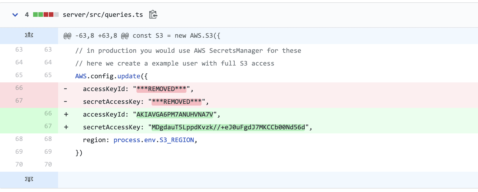 Put the strings you want to replace in passwords.txt and BFG rewrites your entire history. Each password becomes a accessKeyId: "***REMOVED***", ... but you can still see the diff. Lol