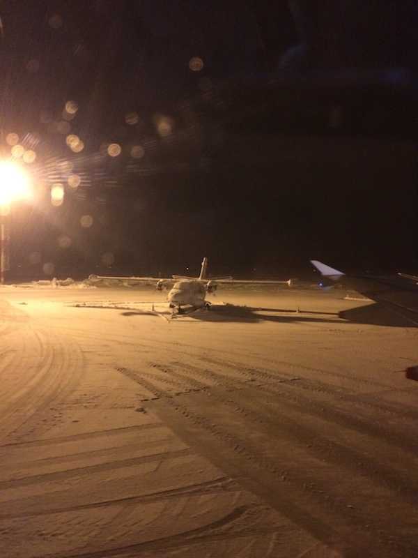 Step out of the gate-to-airplane bus and the ground is covered in ice. The plane is covered in ice. The stairs are covered in ice.