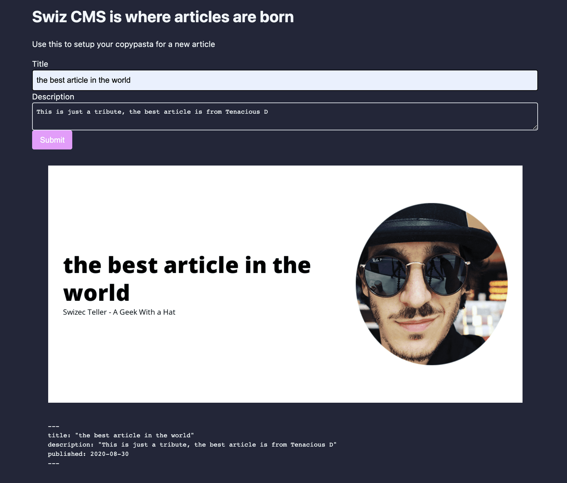 The ultimate goal for this app is to help folks create markdown articles. Copypasta is fine, but I always forget to change the title, write a description, add categories, and create a social card.